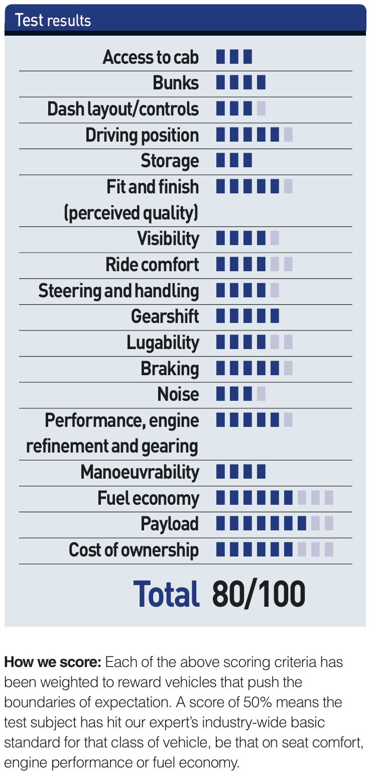 At break time, you can get your pie out of the 66-litre fridge beneath the bunk, warm it in the microwave that you hooked up to the prepared point in one of the rear lockers and eat it at the generously sized table that appears between the seats. Then at the end of the day, you have a choice. Sit on the swivelled passenger seat or on the bunk, which is just the right height, or if you feel decadent, lounge on the bunk with its electrically reclining top third section.
