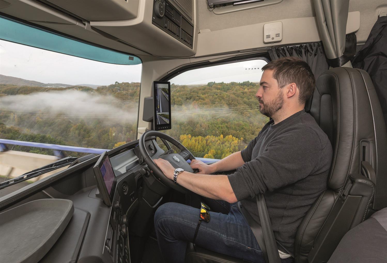 That fear is compounded when a government issued emergency alert appears on my iPhone warning of the severe weather and the threat to life. It’s monsoon-like, but there’s never a nervous moment in the FH16 Aero, and against all odds, the camera systems are more than up to the job. Whereas a mirror would now be covered in muck, the view is crystal clear.