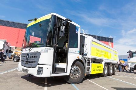 Mercedes exhibited several non-RCV Econics at the show, including the high-visibility rear-steer tridem 8x4 aggregates tipper for operation in London by Cemex Aggregates (pictured). The truck is based on the 3235L Econic, with its OM 936 engine rated at a nominal 350hp/1,400Nm. It has a Wilcox body and Edbro CX14 front end tipping gear.