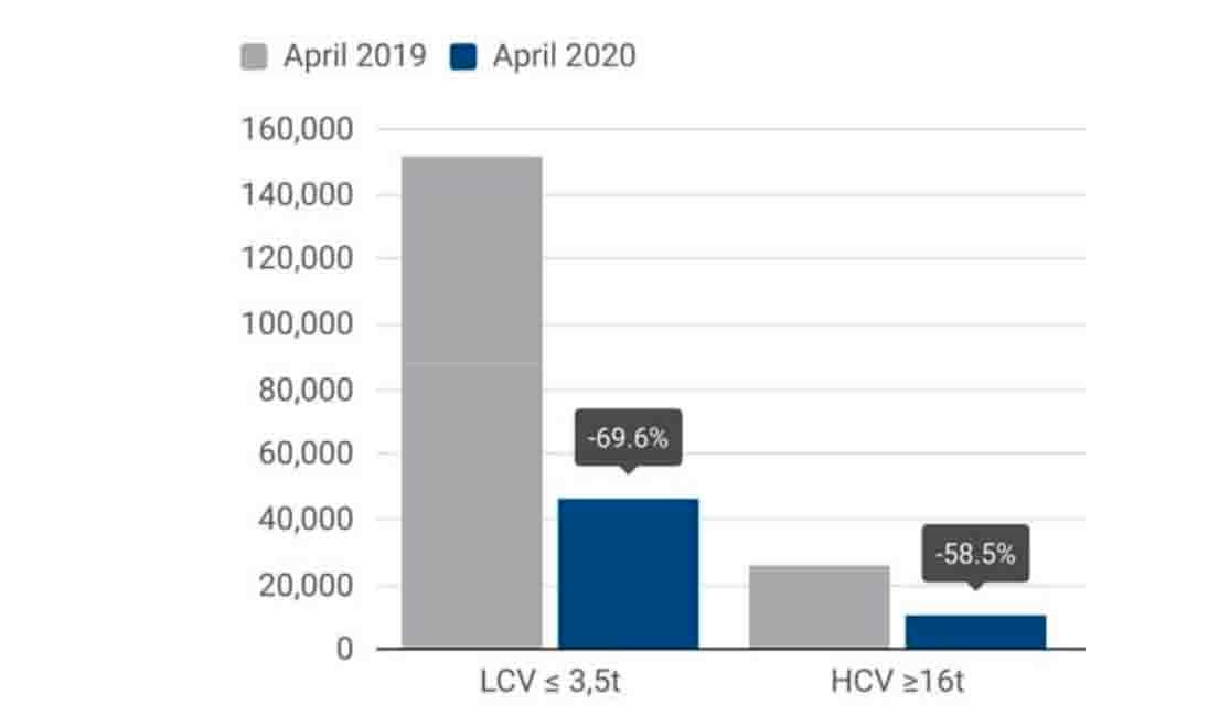Registration figures from the European Automobile Manufacturers Association showed that across the EU new commercial vehicle sales fell by 67% in April, leaving the number of registrations for the year-to-date at -34.5%.