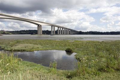 The image shows Orwell Bridge, Ipswich, the route of the A14 as its heads south towards the proposed toll section in Cambridgeshire.