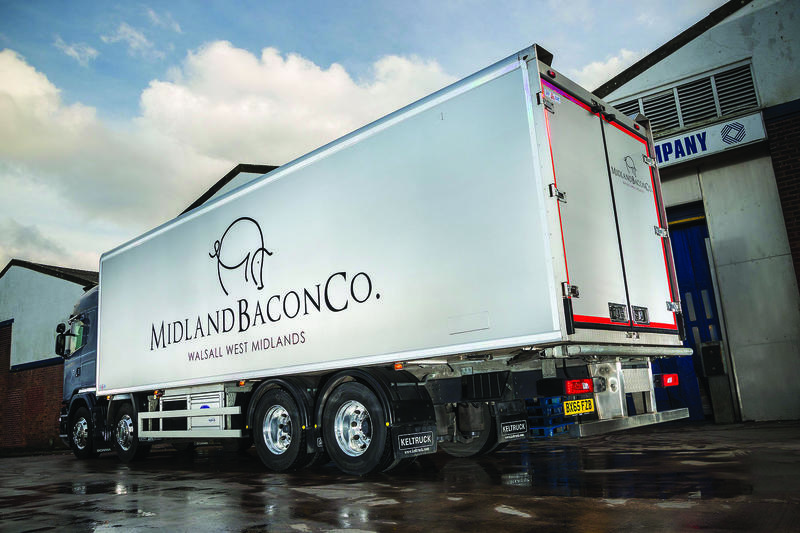 West Bromwich dealer Keltruck has supplied an 8-wheeled refrigerated rigid to Midland Bacon Co. The operator requested the combination to comply with axle loading regulations.