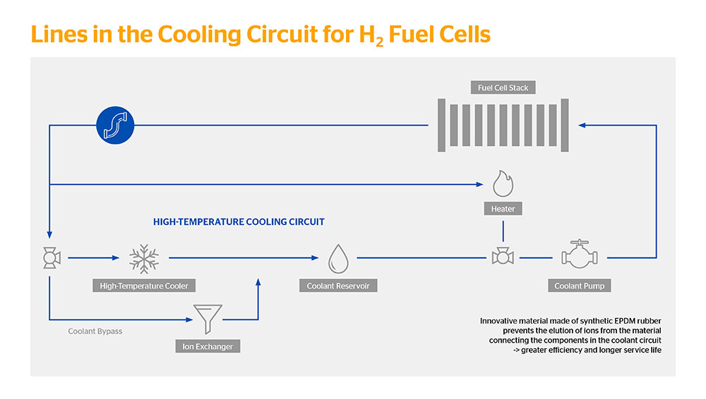 Using synthetic rubber and a mixture of other materials, Continental has created a line for hydrogen fuel cell electric vehicle (FCEV) cooling systems. The new product is designed to reduce the transfer of ions into the cooling circuit which should help to improve the life of certain powertrain components. Ions in the cooling circuit can cause material degradation over time. This leads to reduced efficiencies and increases the chance of potential issues with the fuel cell.