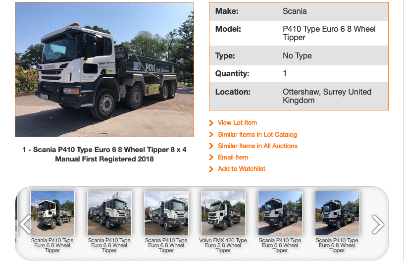 The sale is of vehicles from PMC Soil Solutions and includes two 67-plate Scania P410 8x4 tippers with Hyva tipping gear, Fruehauf bodies and Schur-Co sheeting system. One has covered just 69,099km while the other has racked up 79,319km. There’s also four Scania P410 8x4s on 64-plates which are fitted ith Charlton bodies and have covered a range of distances from 165,000km to 254,000km. Each one has Edbro tipping gear and Schur-Co sheeting systems as well as two-way camera systems.