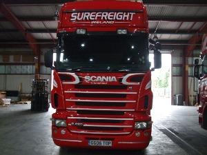 One of the vehicles is a recently painted red Scania, DD55TOP, R420 6x2 Topline Midlift, with Opticruise gearbox and chrome stack and alloy wheels, complete with Surefreight livery.
