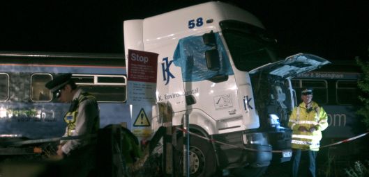 A truck driver working for Royston, Herts firm JK Environmental has been arrested on suspicion of dangerous driving after 21 people were injured when his vehicle collided with a train in Suffolk.