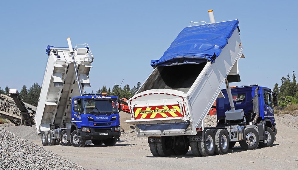 McPhee Haulage of Oban, which operates a fleet of 16 tippers in the Highlands and Islands of Scotland, has recently welcomed two new Scania P410 XTs. Focusing on weight efficiency, the 32-tonne tippers were specified with weight saving polished alloy wheels, PPG insulated alloy bodies with split tailgates, lightweight Harsh FE combined ram and tank tipping gear and Harsh ‘Slide & Cover’ front to rear electric sheeting systems.